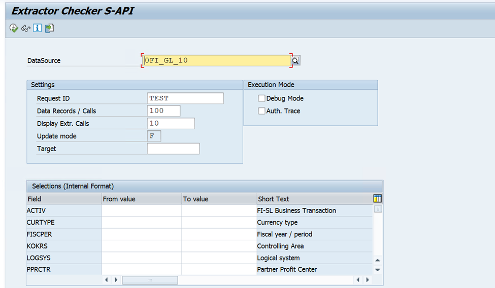 Um einen Testlauf durchzuführen, gehen Sie zur Transaktion RSA3, geben Sie den Extraktor-Namen ein (in diesem Beispiel 0FI_GL_10) und klicken Sie dann auf die Schaltfläche Extraktion.