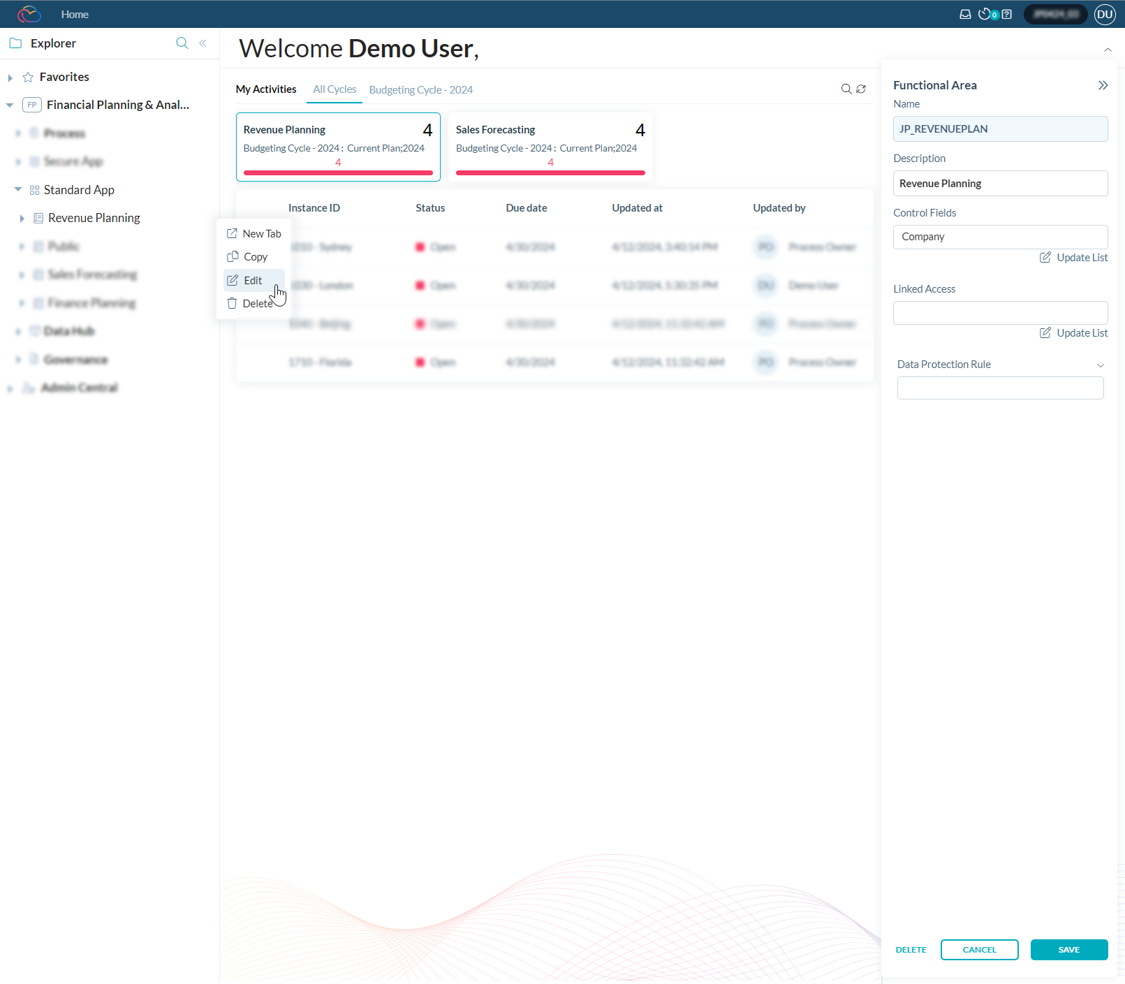 Durch Klicken auf den Funktionsbereich werden Optionen zum Hinzufügen von Objekten, Öffnen in einer neuen Registerkarte , Kopieren, Bearbeiten und Löschen angezeigt. Wenn Sie bei anderen Objekten auf eine Zeile klicken, sind die Optionen auf „in einer neuen Registerkarte öffnen“, „kopieren“, „bearbeiten“ und „löschen“ beschränkt.