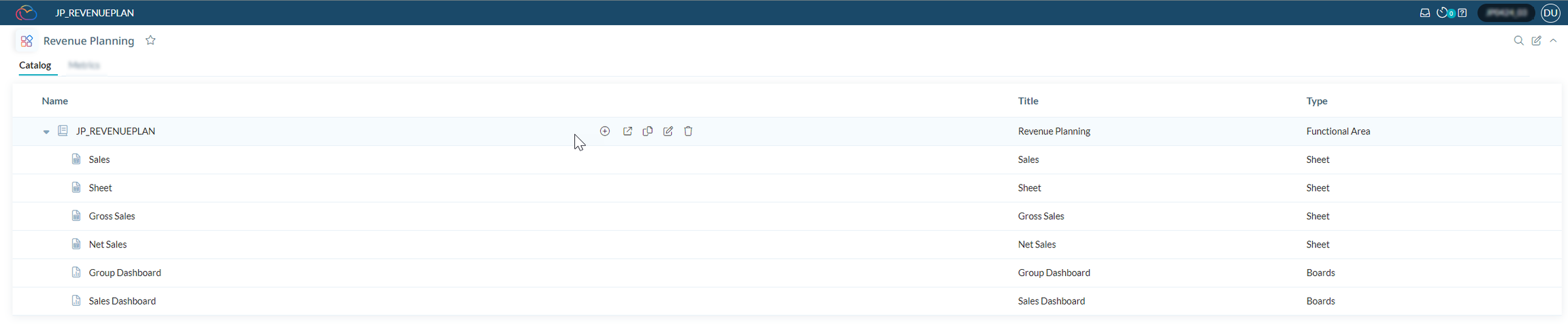 Der Funktionsbereich ist durch Anklicken zugänglich. Sie wird in einer Tabellenstruktur mit Spalten für Name, Titel und Typ angezeigt. Die Spalte „Name“ enthält den Objektnamen, der den Namen und Titel des Funktionsbereichs umfasst. Die Spalte „Typ“ gibt den Objekttyp an, z. B. Funktionsbereich, Blatt oder Boards. Die Zeilen umfassen Blätter, Boards, Modelle usw., die im Funktionsbereich enthalten sind.