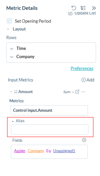 Die Kennzahlformel unterstützt jetzt Anwenderdefinierte Alias-Namen für Eingabekennzahlen in Formel- und Zusammenfassungskennzahlen. Anwender können aussagekräftige Alias-Namen zuweisen, die als Spaltenüberschriften dienen und Formeln mit geschäftsfreundlicher Terminologie verständlicher machen.