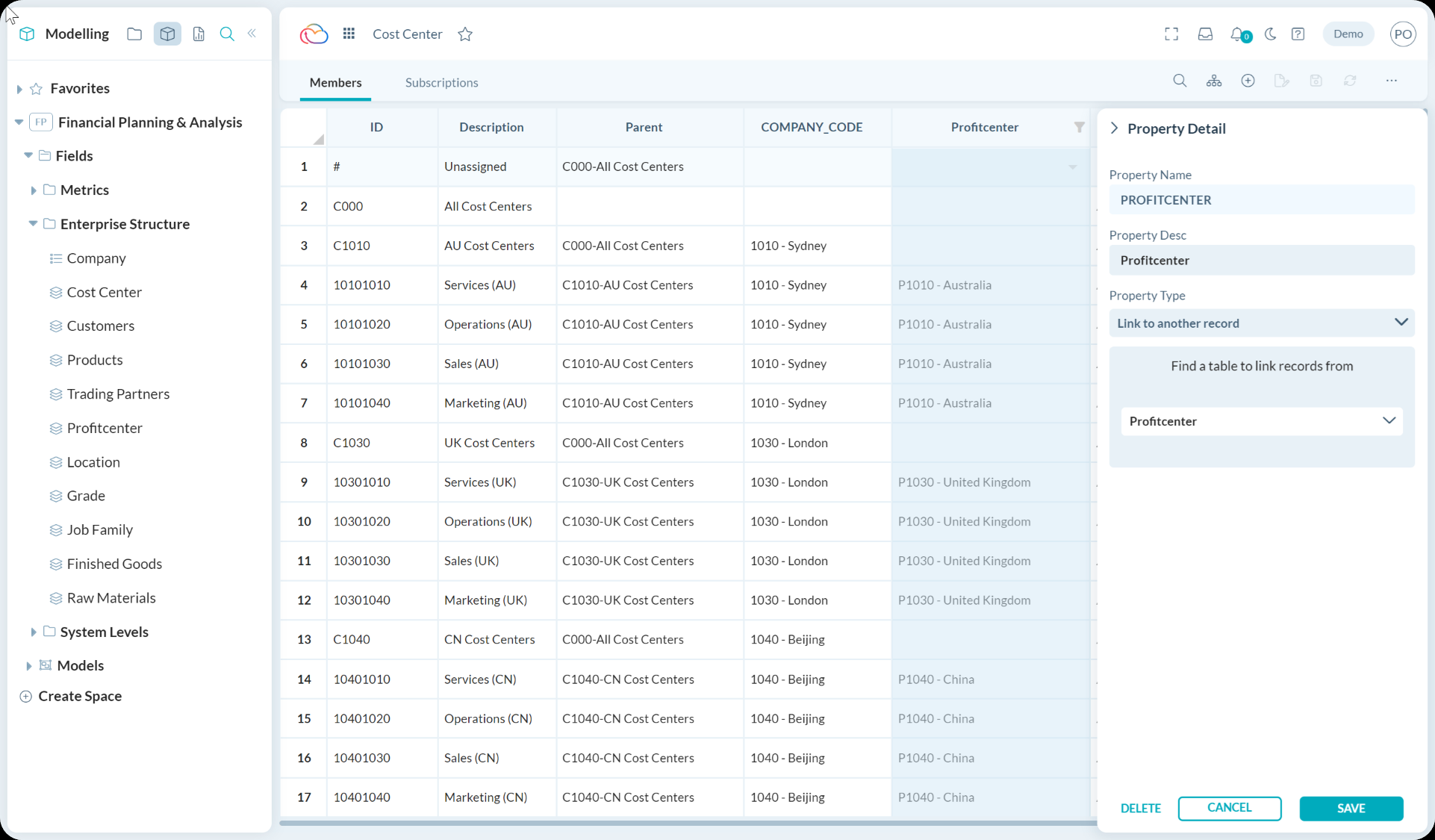 Voraussetzung: Eine definierte Beziehung zwischen Profitcenter und Kostenstelle mit Mit Eigenschaft verknüpft. Das Profitcenter wird als „Mit Eigenschaft verknüpft“ im Feld „Kostenstelle“ angelegt, und die vollständige Zuordnung der Kostenstelle zum Profitcenter wird wie in der folgenden Abbildung dargestellt aktualisiert: