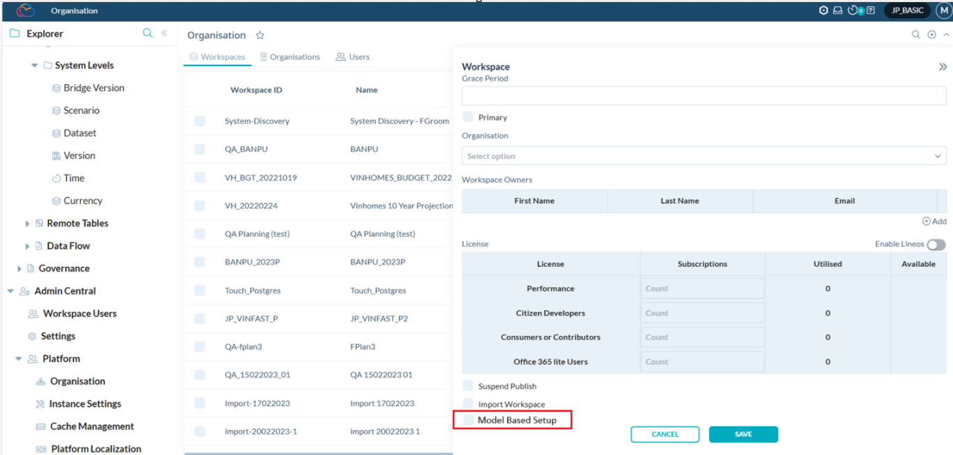 Die Option Szenario-Bemaßungstyp wurde aus dem Dropdown-Menü für den Bemaßungstyp bei der Bemaßungserstellung entfernt. JustPerform erstellt jetzt automatisch eine einzelne Szenario-Dimension, wenn Sie einen neuen Arbeitsbereich einrichten, um eine konsistente Arbeitsbereichskonfiguration zu gewährleisten. Die automatisch erstellte Szenario-Dimension kann nicht gelöscht werden, um die Integrität des Arbeitsbereichs zu schützen.