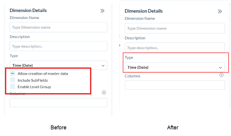 Die Konfigurationsoptionen für die Zeit- (Datums-) Dimensionen wurden gestrafft, indem die folgenden Einstellungen entfernt wurden: Erlauben Sie die Erstellung von Stammdaten, schließen Sie Unterfelder ein und aktivieren Sie die Ebenengruppe. Diese Vereinfachung bietet eine standardisierte Konfiguration der Zeitdimensionen, die mit den aktuellen Anforderungen der Plattform übereinstimmt.