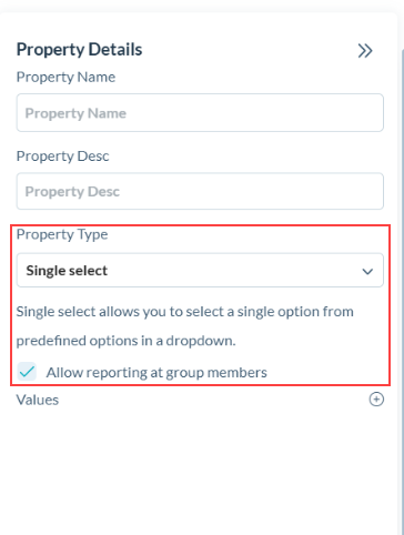 Der Eigenschaftstyp "Gruppe" wurde in "Einzelauswahl" umbenannt und enthält jetzt ein optionales Kontrollkästchen "Berichterstattung bei Gruppenmitgliedern zulassen". Diese Erweiterung konsolidiert zwei separate Eigenschaftstypen zu einem einzigen, einheitlichen Typ, der sich an verschiedene Anwendungsfälle anpasst, die Konfiguration der Eigenschaften vereinfacht und die Verwirrung der Benutzer verringert.