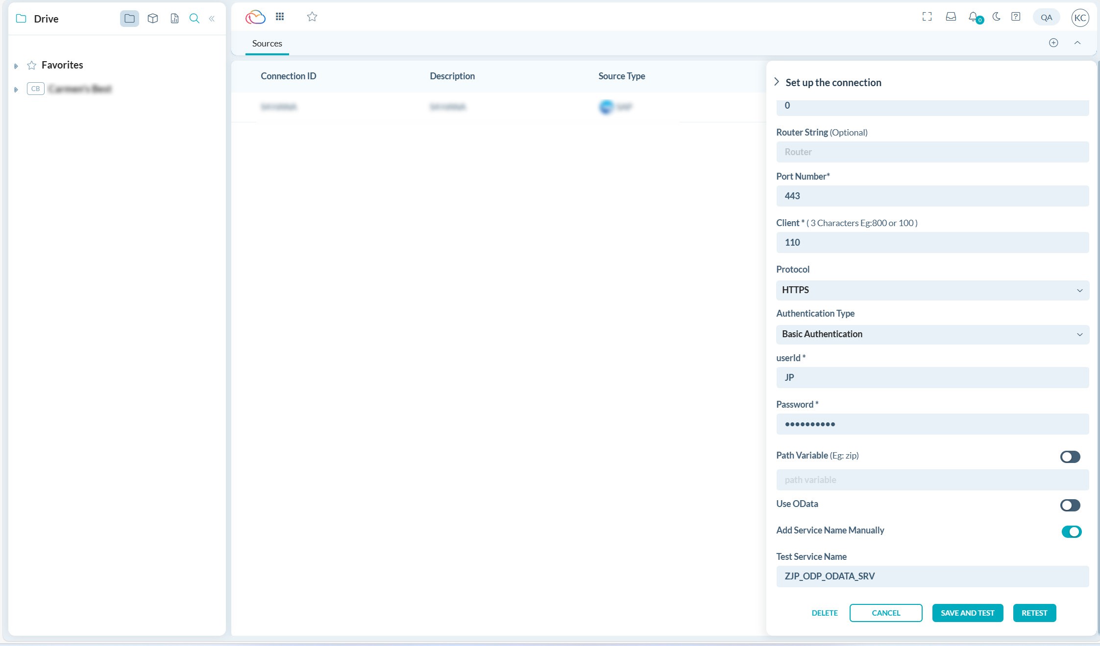 Richten Sie nach dem Speichern die Verbindung ein, indem Sie alle erforderlichen Details wie Anwendungsserver, System-ID, Instanznummer, Router-String, Portnummer, Client, Protokoll und Authentifizierungstyp angeben, wenn Sie die OData-Option aktivieren. Nach Angabe der Details klicken Sie auf Speichern und testen, um die Verbindung zu testen.