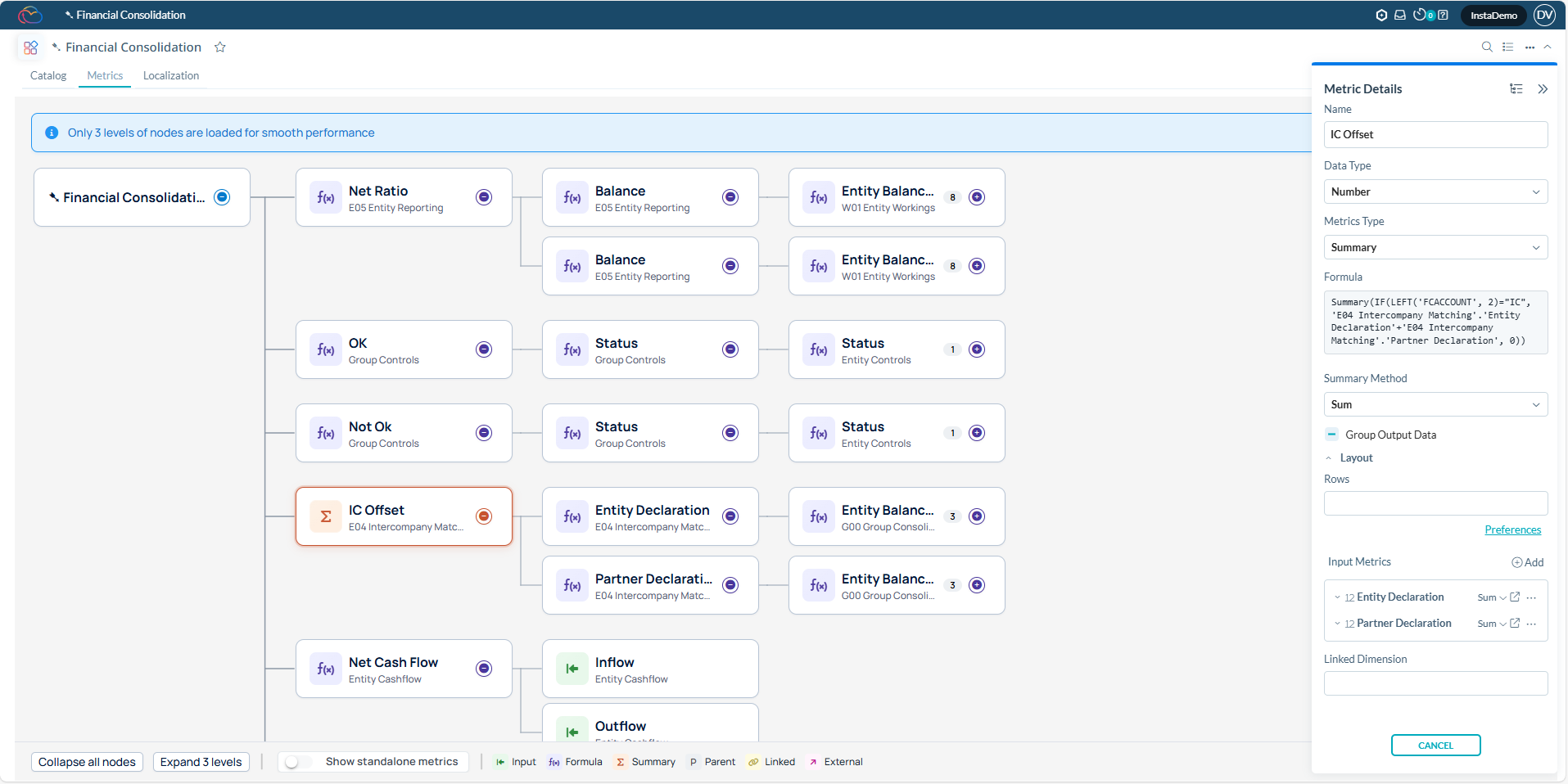 Die erweiterte Strukturansicht enthält visuelle Indikatoren in Form von Farbkodierungen und Symbolen für verschiedene Kennzahltypen, darunter Formeln, Zusammenfassungen, übergeordnete Kennzahlen, Links und externe Kennzahlen. Die Anwender können mit den Steuerelementen zum Erweitern und Verkleinern durch die Baumstruktur navigieren, wobei die Funktion zum Erweitern aller Ebenen intelligent auf drei Ebenen beschränkt ist, um eine optimale Leistung zu erzielen. Jeder Kennzahlknoten zeigt detaillierte Informationen in einem Seitenbereich an, einschließlich der neu hinzugefügten Formelsichtbarkeit für formelbasierte Kennzahlen, die einen vollständigen Kontext für die Analyse bieten, ohne die Oberfläche der Baumansicht zu verlassen.