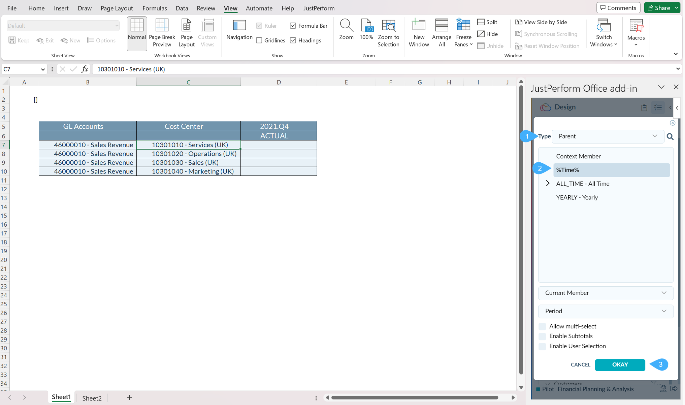 - Ändern Sie den Anwender-Kontext für Version: Ändern Sie die Version von Anwenderkontext auf PLAN/ACTUAL und laden Sie neu, um die Auswirkungen der Zeitelemente im Bericht zu sehen.