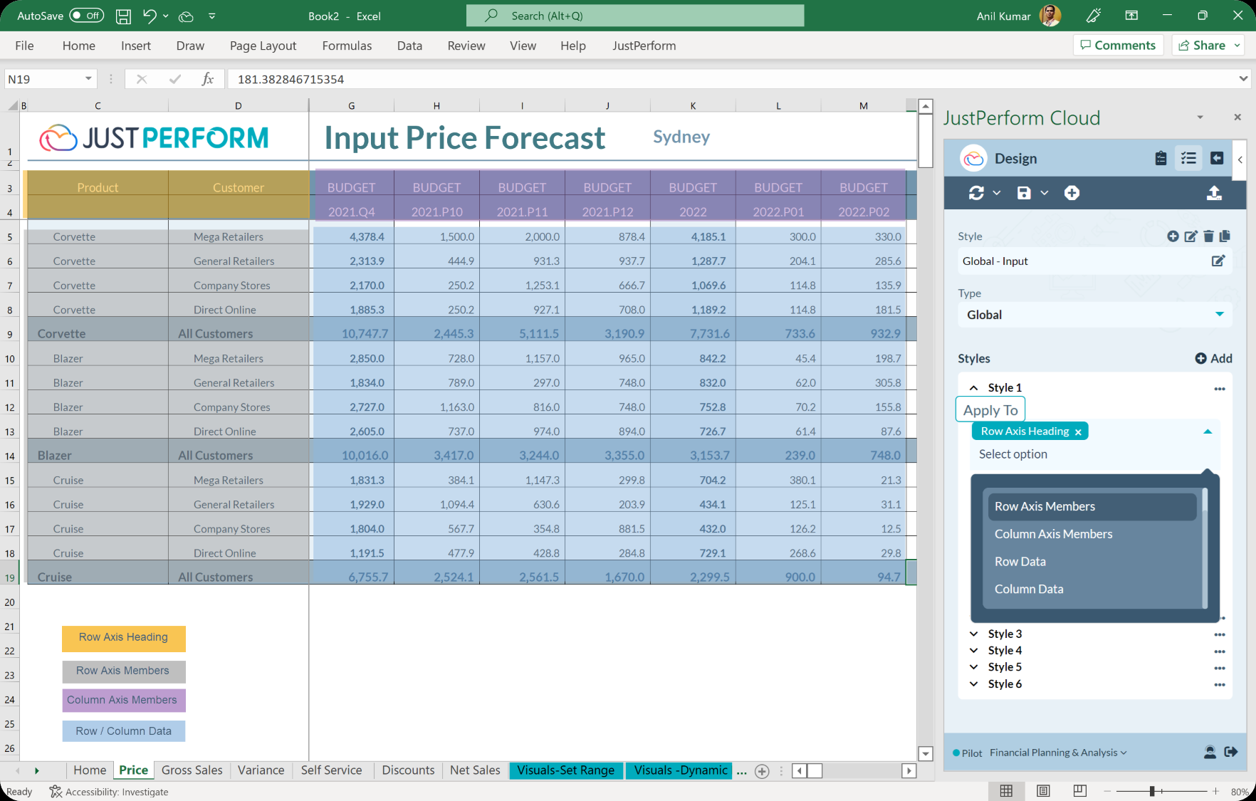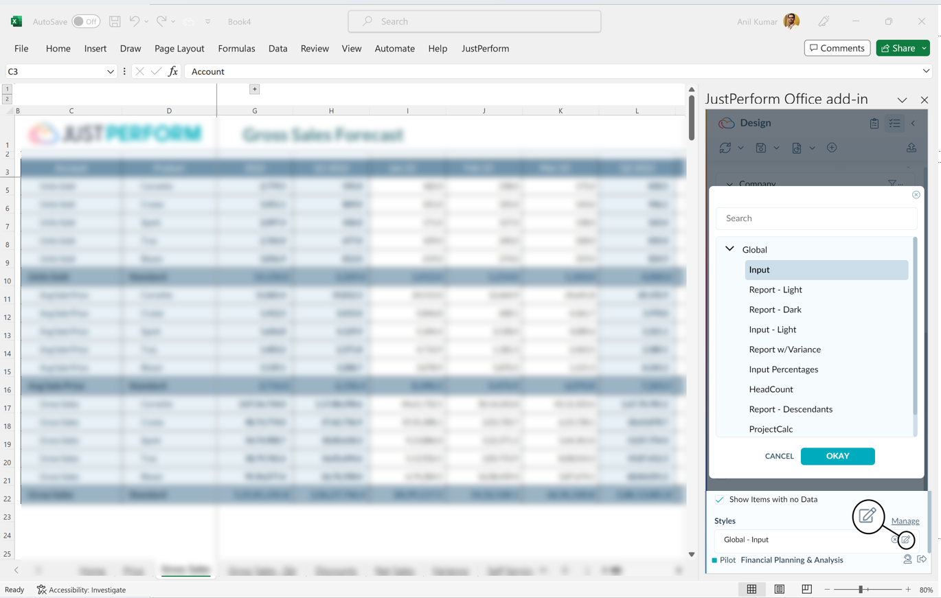 Erstellen Sie auf ähnliche Weise unterschiedliche Formate, indem Sie für jeden Typ an Daten, Achsenelementen und spezifischen Elementen usw. die gleichen Schritte 1-5 ausführen. Sobald die Formate fertiggestellt sind, wird das Ergebnis als Formatvorlage gespeichert und kann für jede JustPerform-Vorlage in der Arbeitsmappe oder im Arbeitsbereich (entweder „Global“ oder „Buch“) mit der Funktion Format anwenden verwendet werden.