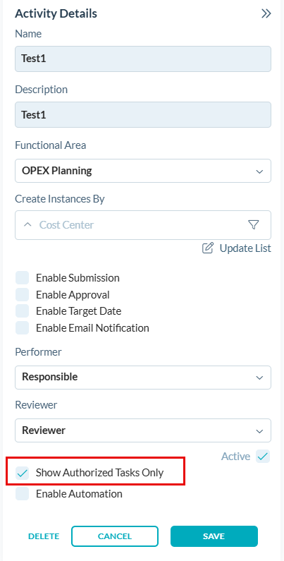 Im Dialogfeld Aktivitätsdetails wurde ein neues Kontrollkästchen Nur autorisierte Aufgaben anzeigen hinzugefügt. Wenn diese Option aktiviert ist (Standardeinstellung), zeigt das System nur Aufgaben an, die den zugewiesenen Rollen und Berechtigungen des Benutzers entsprechen. Interne Link-Aufgaben, die der Benutzer nicht sehen darf, werden automatisch ausgeblendet. Dadurch wird sichergestellt, dass Benutzer nur mit relevanten, erlaubten Aufgaben interagieren, während die bestehende rollenbasierte Autorisierungslogik erhalten bleibt.