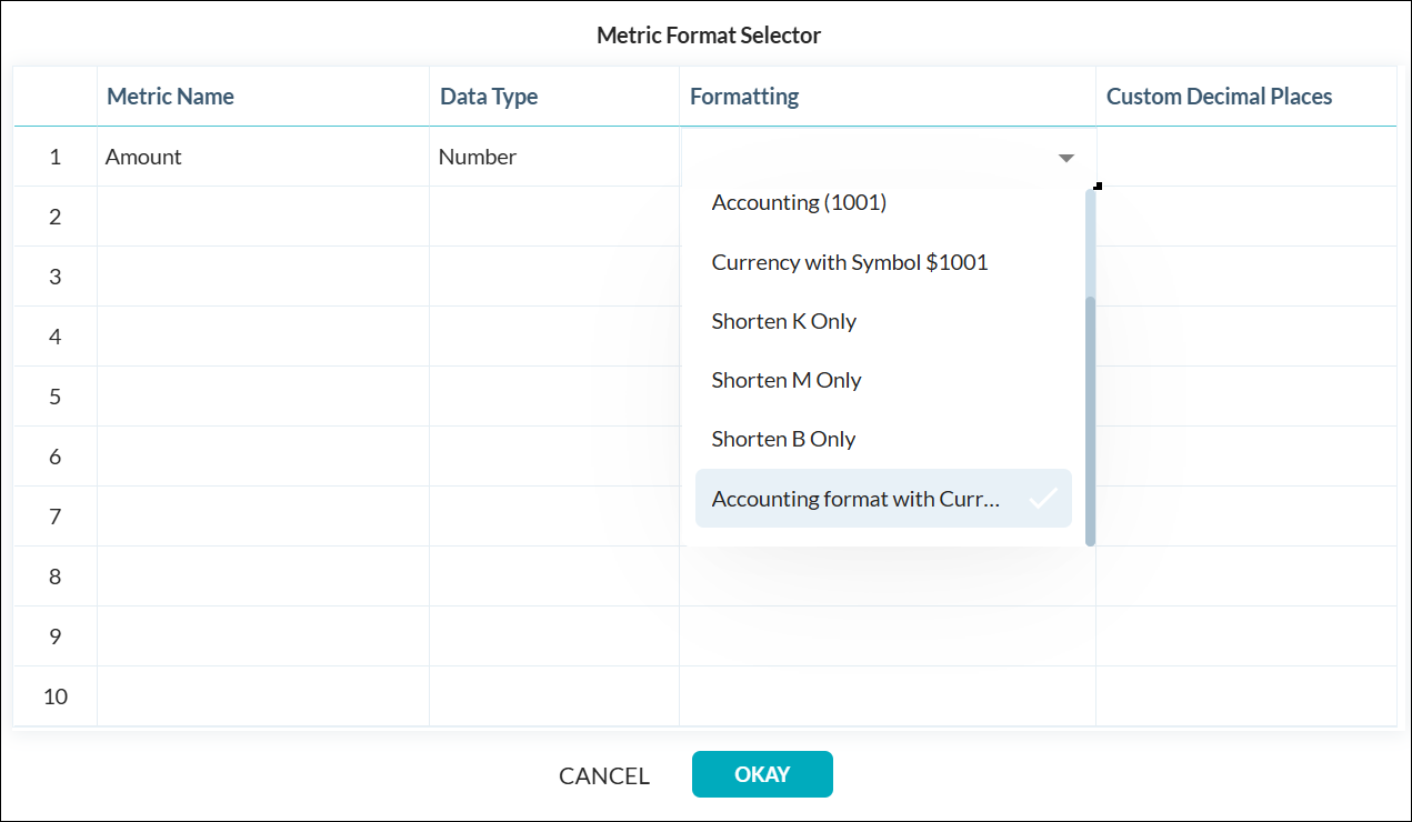 JustPerform bietet jetzt vier zusätzliche Optionen zur Formatierung von Metrikdaten für Zahlen in Tabellen, Metriken und Snippets. Diese Formate bieten mehr Flexibilität bei der Darstellung von großen Zahlen: