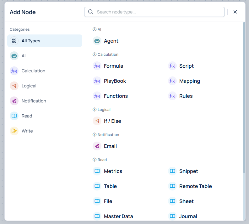 For detailed information on each node type, see Understanding Node Types and Categories.