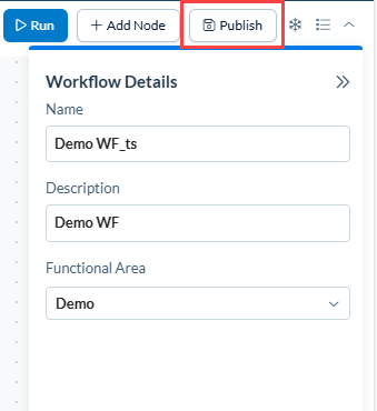 Publishing saves all workflow configurations permanently. Workflows can be published at any stage of development, including with incomplete node configurations.