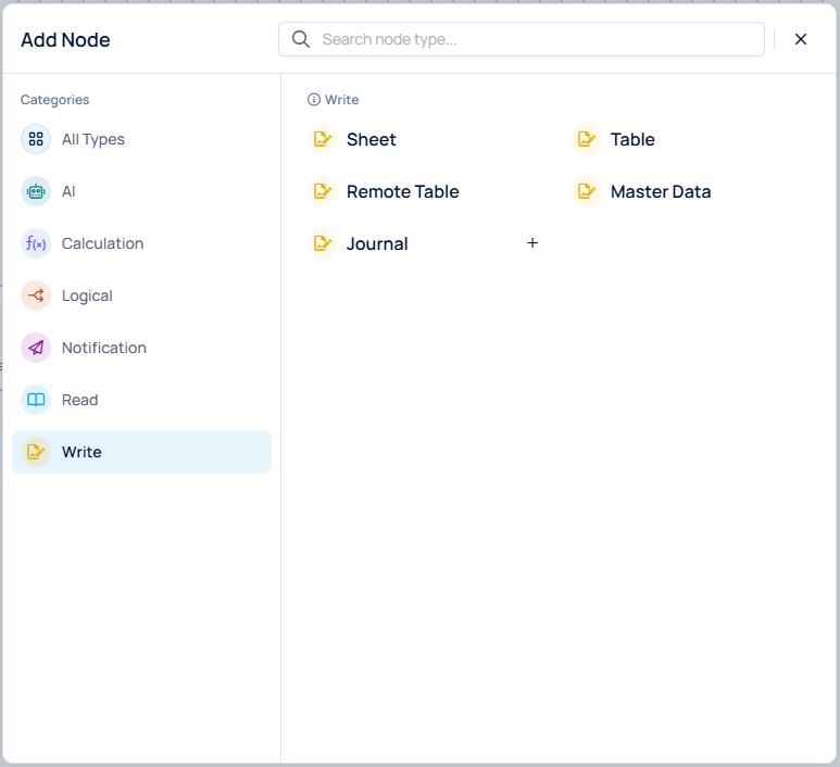 Note: Write nodes only accept input connections and cannot provide output connections to other nodes. They function as terminal nodes, marking the end of data flow paths in the workflow.