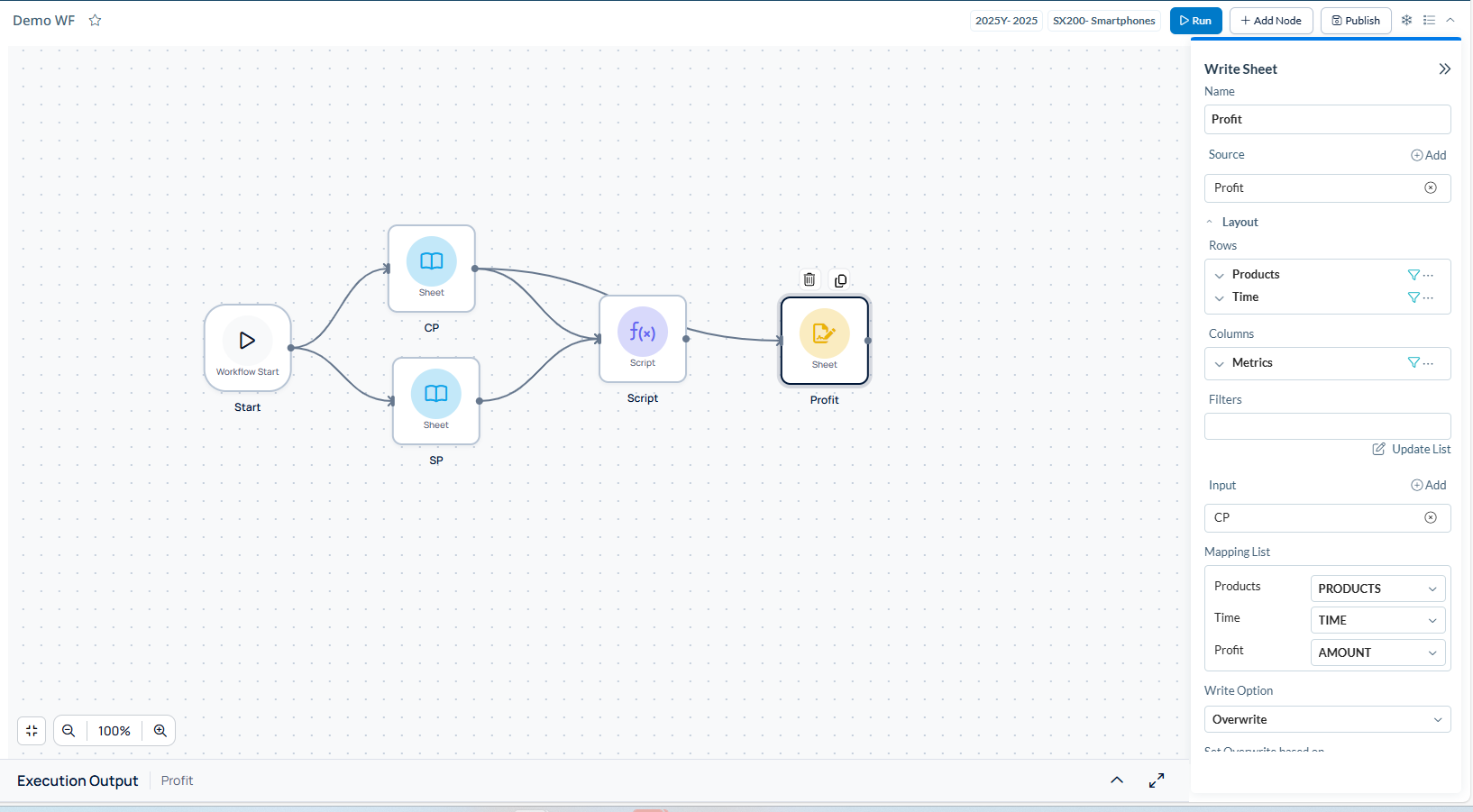Note: Metric selection is mandatory regardless of where metrics appear in the layout structure (Rows, Columns, or Filters). Each metric can only be used in one Write node across the entire workflow. The system validates metric uniqueness and displays an error if duplicates are detected.