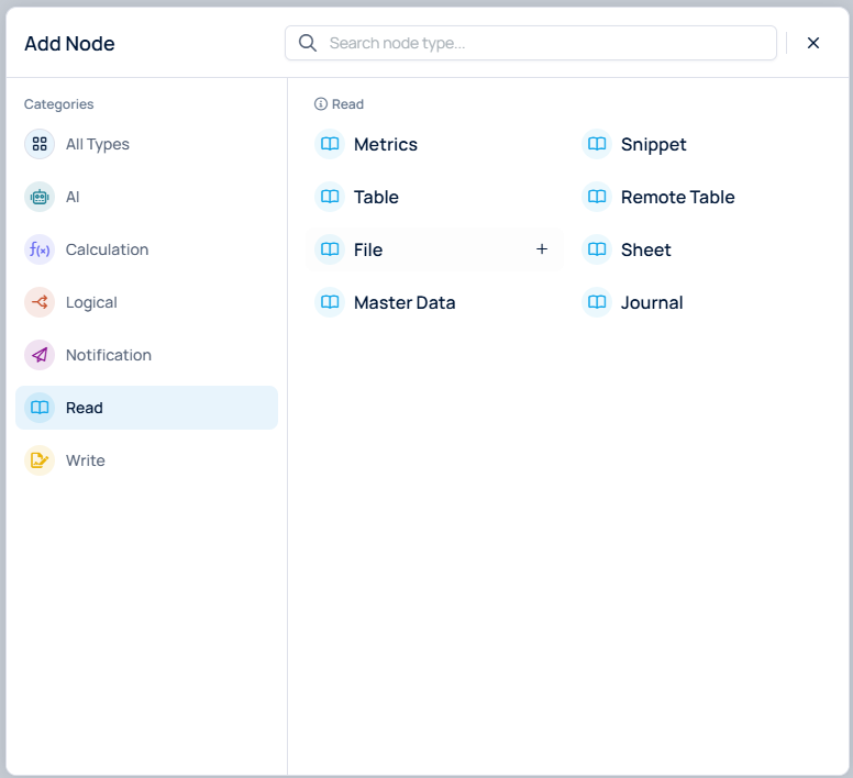 Read nodes retrieve data from various source systems and make it available to downstream nodes in the workflow. The Read category provides eight different node types, each designed for specific data sources.