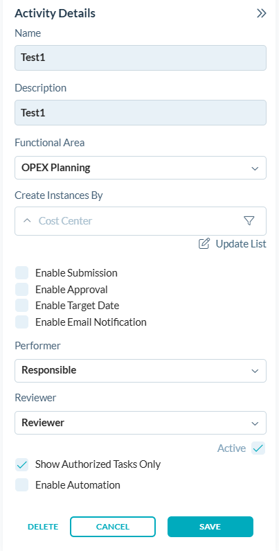 The purpose of automation is to enable changes in data status for metrics as the status of an activity changes. When automation is enabled in an activity, Automation 1 is created by default. Automation includes an automation name and one or more groups, where all customization is done.