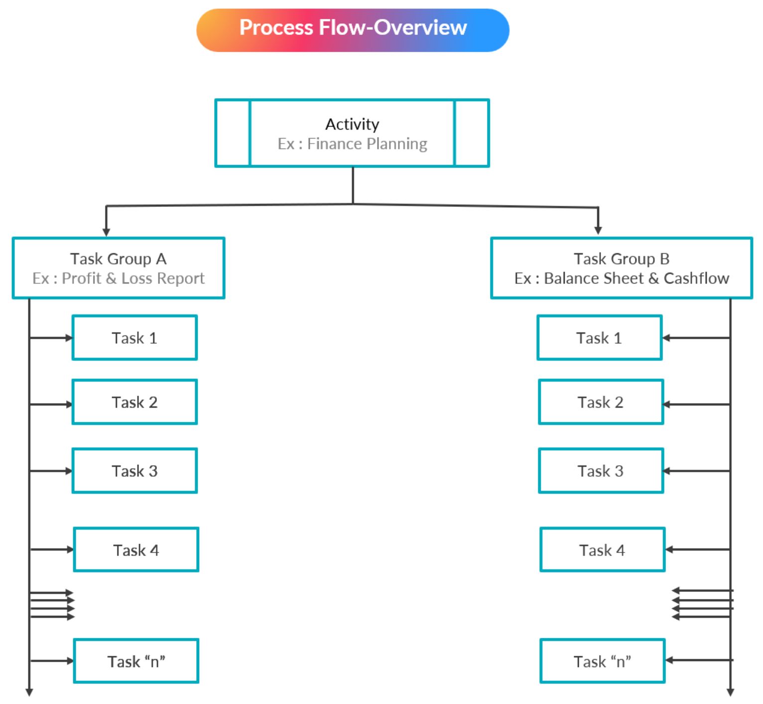 Example: For creating a Profit & Loss Report, tasks might include gathering data from required processes, running allocations, performing eliminations, and generating the report.