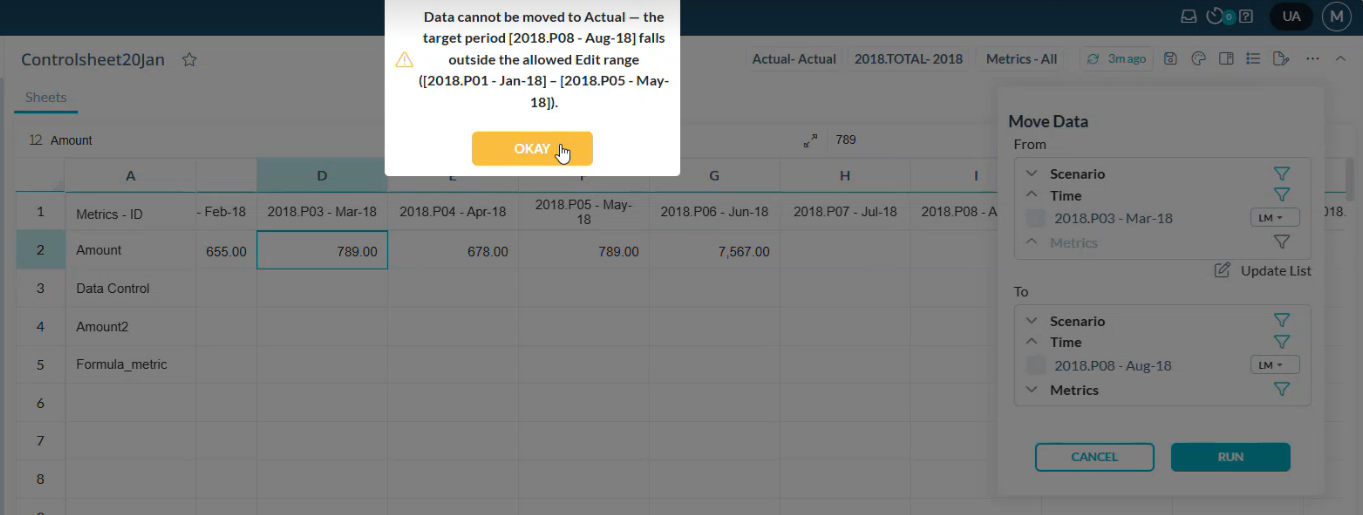 The Move Data operation is enhanced to perform pre-move validation before executing data transfers. If the target period falls outside the configured Edit From/To or Applicable From/To range, or the target version is locked, the system displays a validation message and preserves the original source data. When both Edit and Applicable ranges are configured, the Applicable range takes priority for validation.