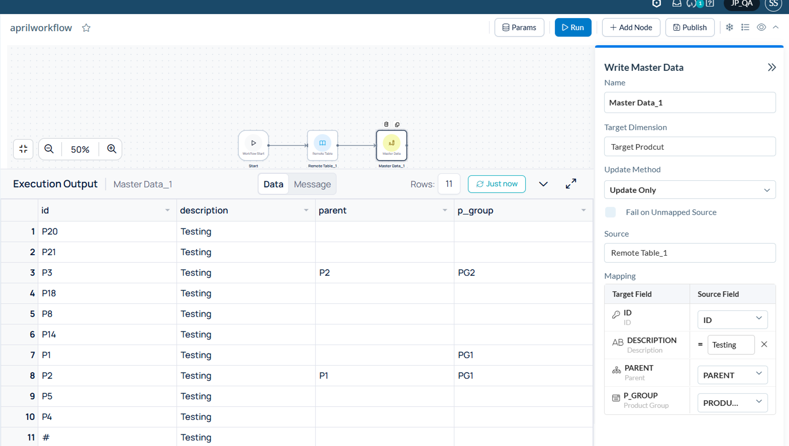 A new Master Data Write node is available in the Workflow Designer. This node enables workflows to write data directly to master data tables within the workspace. The node supports insert and update operations and allows users to map source columns to target table columns for automated data synchronization and dimension member management.