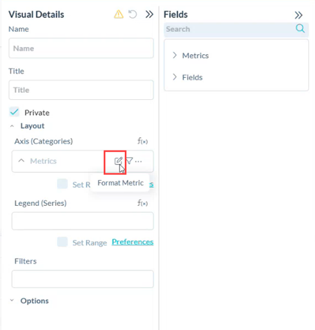 Visual snippets are enhanced to support per-metric formatting. A Format Metric button is available next to metrics in the visual details panel, allowing users to configure the display format and custom decimal places for individual metrics. Formatting applies consistently to both the table grid and visual data labels.