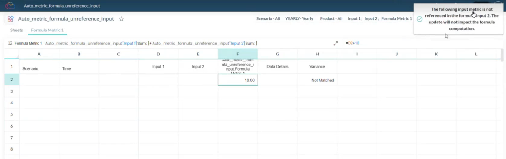 The metric publish and data refresh operations are enhanced to display an informational message when one or more configured input metrics are not referenced in the metric formula. This notification helps users identify potential misconfigurations that may prevent delta change calculations from triggering as expected.