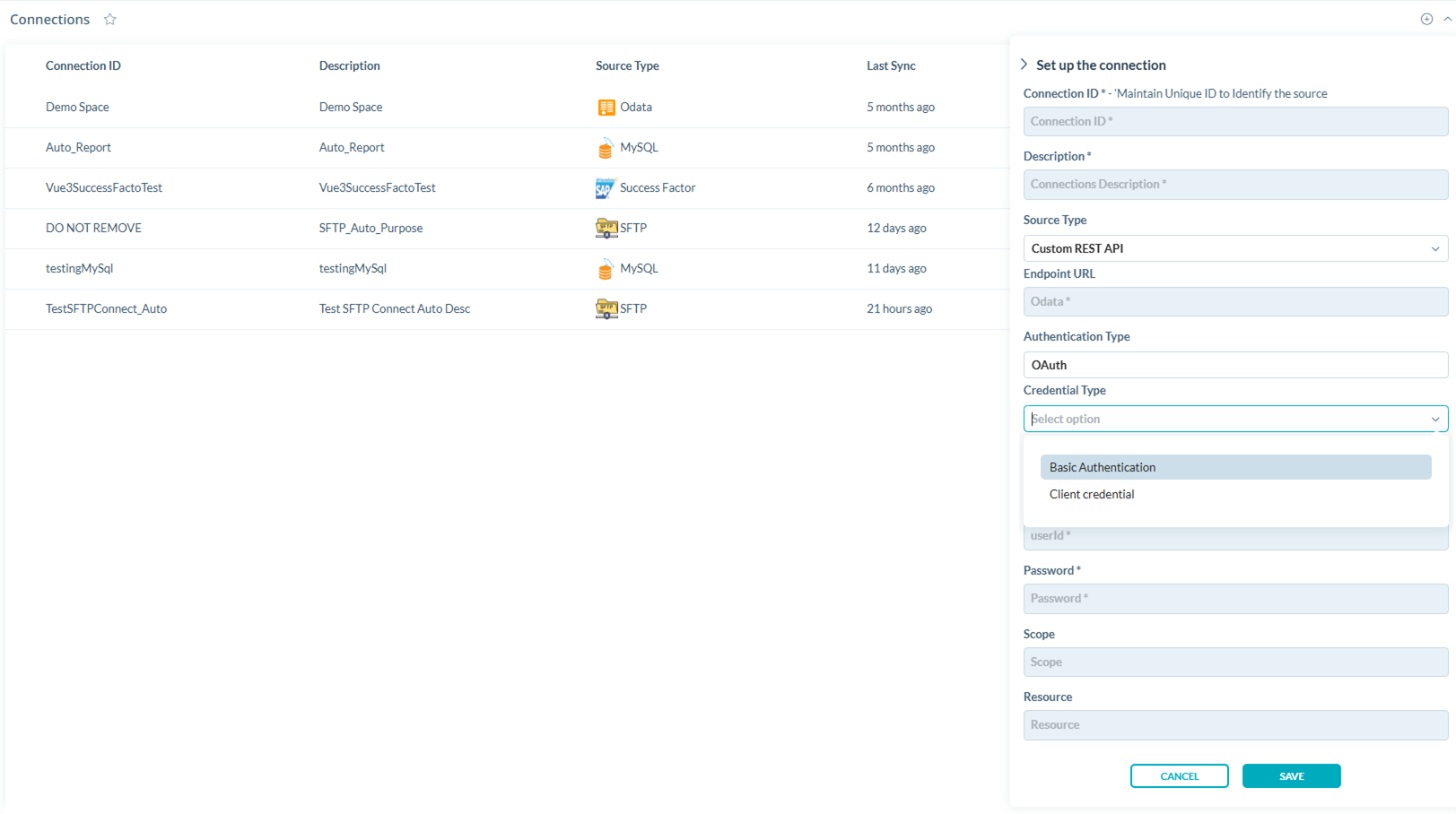 This release introduces a new Custom REST API source type in the Connections module. Administrators can configure connections to external REST API endpoints using OAuth authentication with support for Basic Authentication and Client Credential authentication types. On successful connection, users can load data from the external REST API to a remote table in JustPerform.
