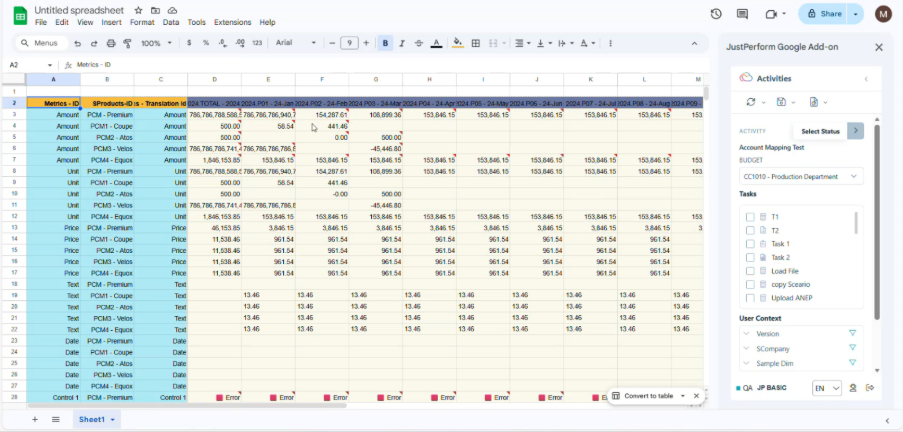 This release introduces the JustPerform Google Sheets Add-In, which enables users to log in, browse activities, and load, save, and refresh sheet and snippet data directly within Google Sheets. The add-in installs from the Google Workspace Marketplace and launches from Extensions > JustPerform > Launch in Google Sheets.