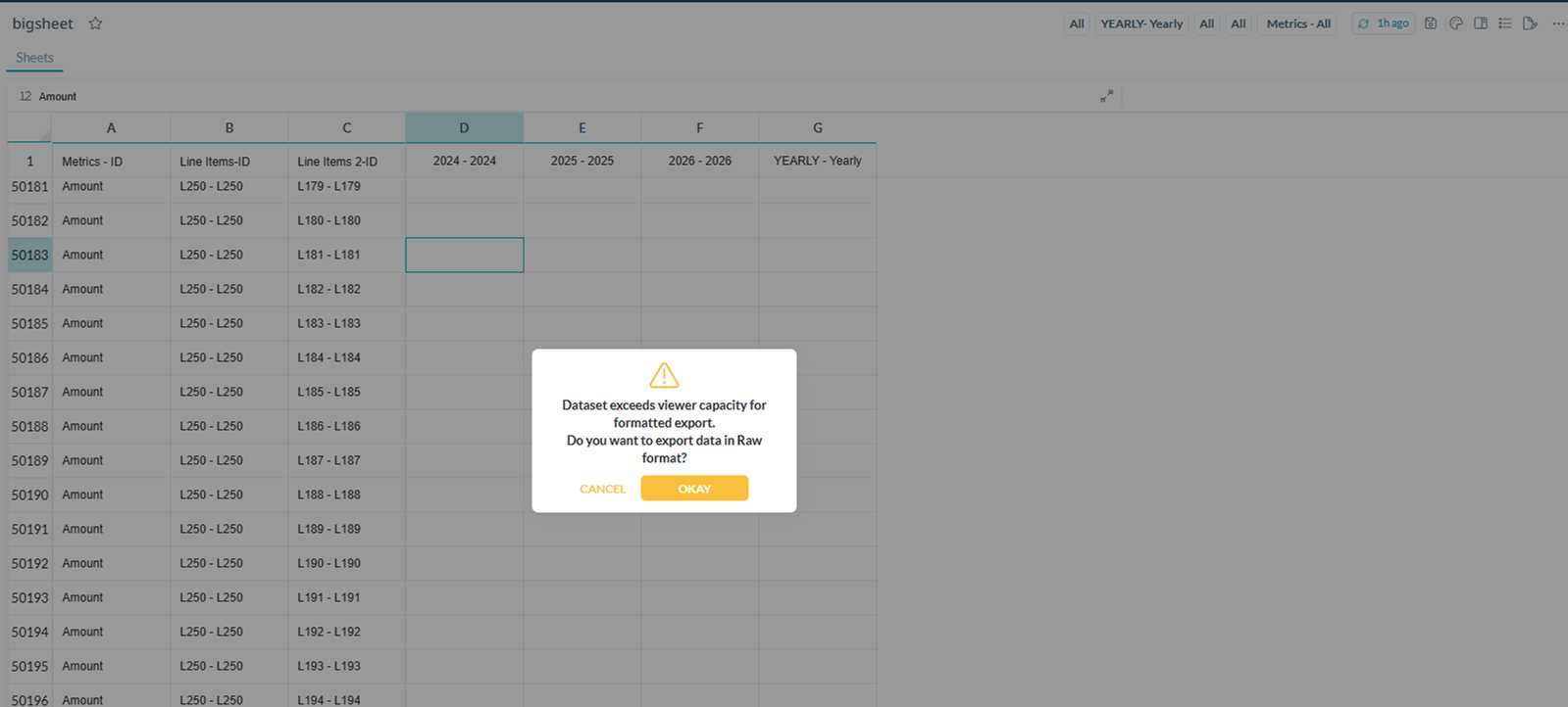 The sheet and snippet export functionality is enhanced to support large datasets that previously caused memory crashes during formatted exports. When a dataset exceeds 100,000 cells, the system prompts the user with an option to export data in raw format instead of formatted export.
