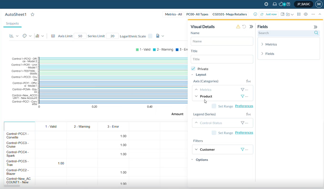 Les rapports sur l'état des contrôles sont améliorés pour prendre en charge les extraits visuels, les extraits de rapport et les ensembles de contrôles. Les utilisateurs ajoutent la pseudo-dimension État du contrôle aux présentations d'extraits pour analyser les états des mesures de contrôle (Valide, Avertissement, Erreur) à l'aide d'agrégations basées sur le nombre.