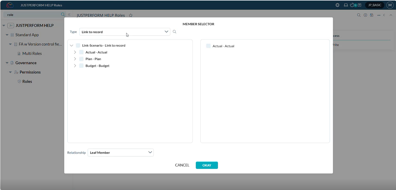 Le sélecteur de membre Roles Data Access est amélioré pour prendre en charge le type de propriété Link to Property (Lien vers un autre enregistrement) en tant que sélection valide.