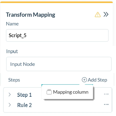 Cette version introduit le nœud Mapping, un nouveau type de nœud dans la catégorie Transformations. Il permet aux utilisateurs de transformer et d'enrichir les données en appliquant des tables de correspondance prédéfinies aux ensembles de données d'entrée. Les utilisateurs configurent une ou plusieurs étapes de mappage - chaque étape crée une nouvelle colonne de sortie en effectuant une recherche dans une table de mappage sélectionnée. Le nœud comprend le mappage des champs sources, la gestion des valeurs non mappées (héritée de la table de mappage) et un aperçu de la simulation des données en temps réel dans le panneau central.