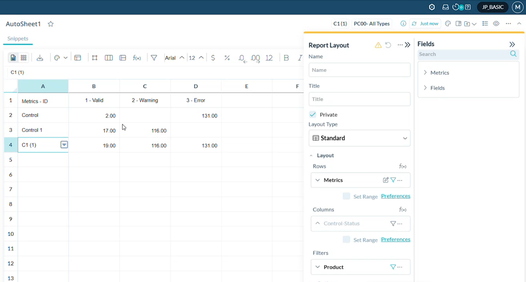 Les utilisateurs ajoutent le statut du contrôle aux présentations des extraits de rapport en le faisant glisser et en le déposant dans les lignes, les colonnes ou les filtres.