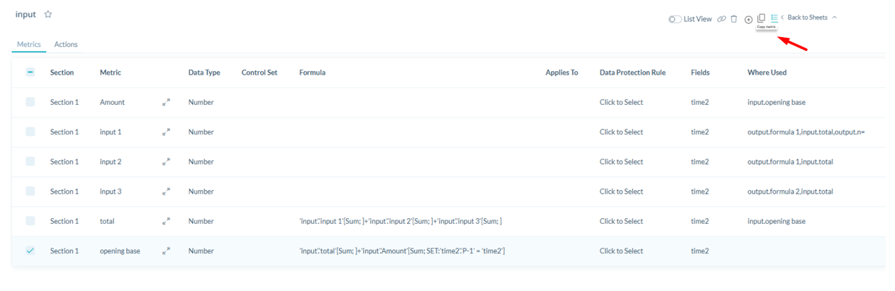 Cette fonctionnalité se présente sous la forme d'une option supplémentaire agrégée à l'option SUPPRIMER existante, autorisant la duplication rapide des métriques d'entrée configurées lors de l'élaboration des formules.