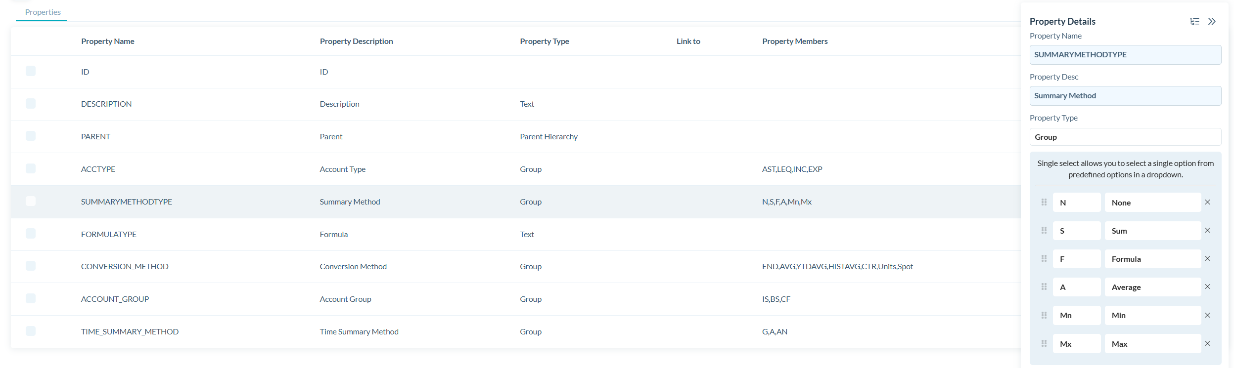 Le bouton Détails du dimension se trouve dans l'en-tête de niveau 2 de l'écran Dimension. En cliquant sur ce bouton, un tableau répertoriant toutes les propriétés du dimension sélectionné s'affiche, avec des informations clés telles que le nom de la propriété, la description, le type, le lien vers, les membres de la propriété et le lieu d'utilisation.