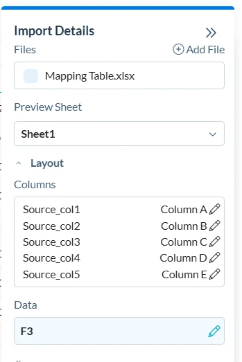 Mise en page > Colonnes - Répertorie les colonnes de la table de mappage avec les colonnes du fichier mappé automatiquement. Pour les tableaux de correspondance des plages, chaque colonne Source s'affiche sous forme de lignes De et À.