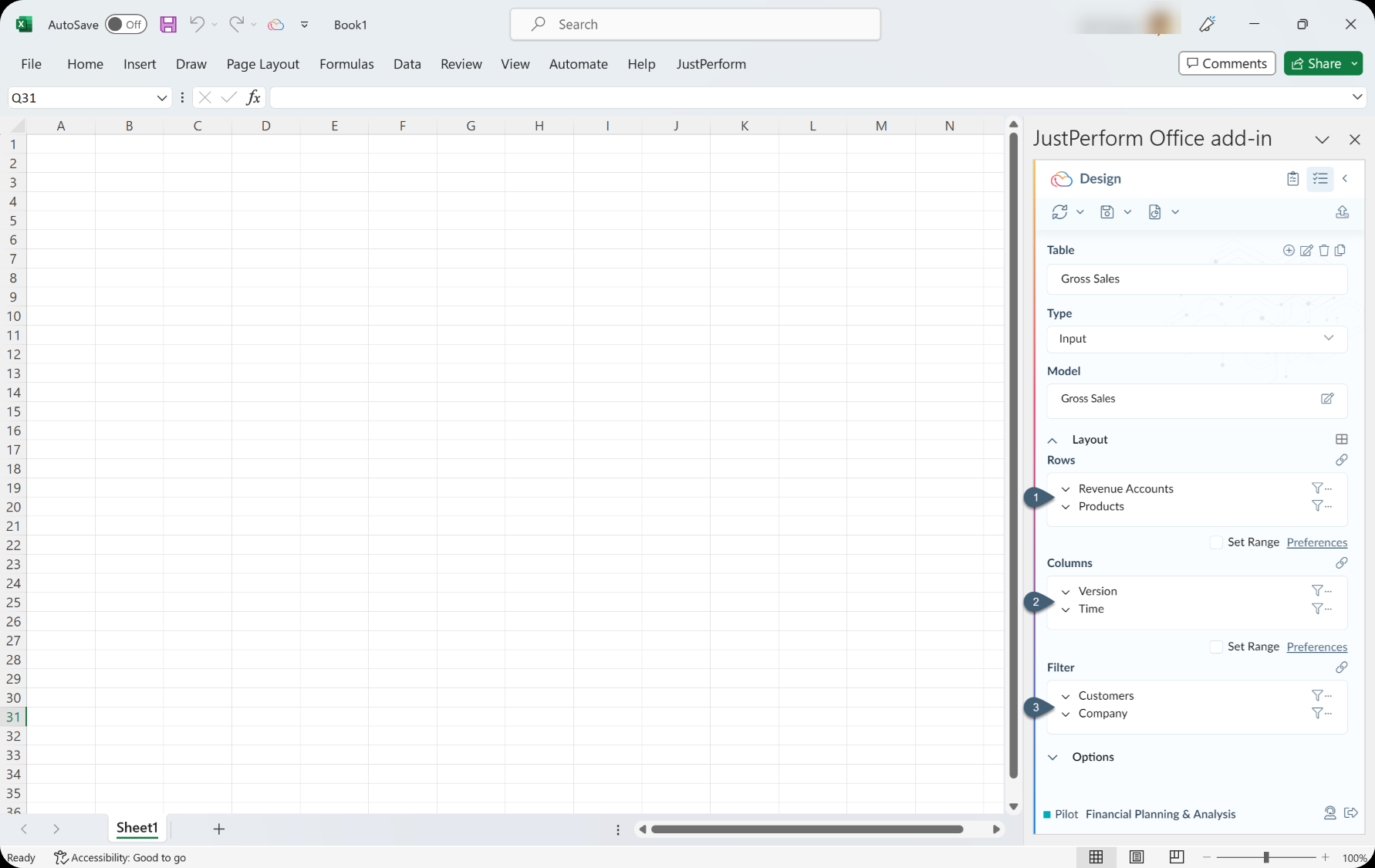 Si les axes des lignes et des colonnes sont statiques et que les membres sont saisis directement dans la feuille, la mise en page est déjà définie et elle affichera les plages exactes pour les lignes et les colonnes lorsque l'utilisateur cliquera sur le bouton Mise en page.